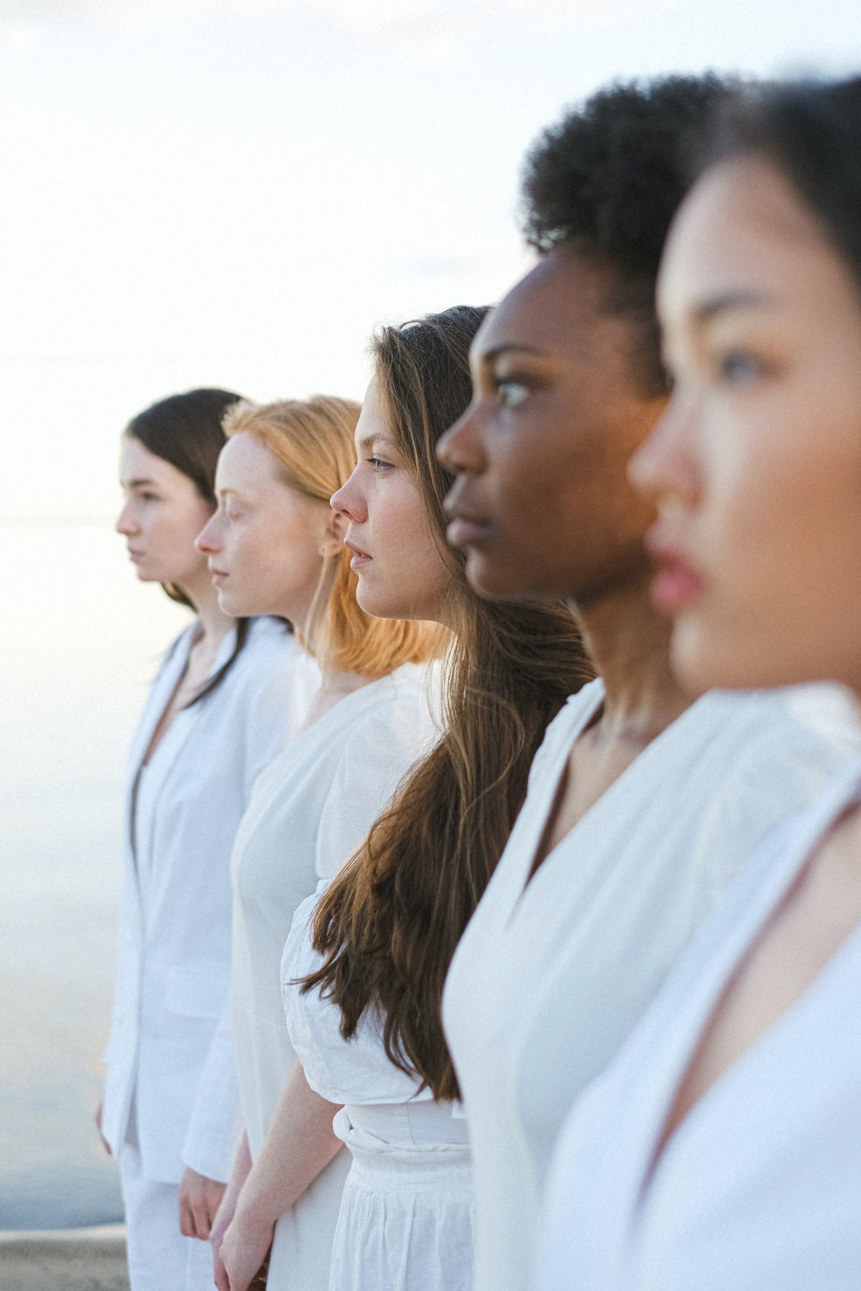 Five women of different racial background standing side-by-side.